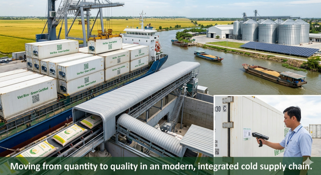 Logistics và chuỗi cung ứng lạnh – Mắt xích quyết định lợi nhuận thực tế: Trong bối cảnh chi phí vận tải biến động, logistics đã không còn là khâu hậu cần đơn thuần mà trở thành nhân tố quyết định lợi nhuận thực tế của doanh nghiệp. Theo khảo sát từ các đơn vị logistics chuyên ngành, tỷ lệ mất mát sau thu hoạch và vận chuyển đang ở mức 5 đến 10 phần trăm do ảnh hưởng của ẩm mốc và hư hỏng. Với chi phí vận tải quốc tế chiếm từ 100 đến 200 USD mỗi tấn, việc làm chủ chuỗi cung ứng lạnh (Cold Chain) và quy trình chuẩn hóa từ khâu sấy đến đóng gói chân không là yêu cầu sống còn.