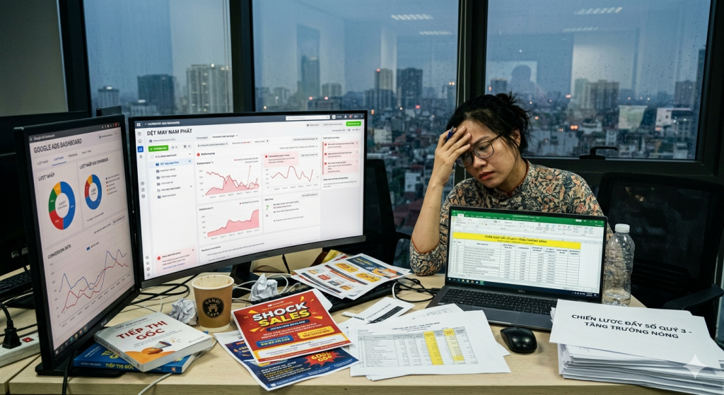 Một thực trạng phổ biến tại 90% doanh nghiệp dệt may hiện nay là làm marketing theo kiểu thực dụng. Họ đồng nhất marketing với việc chạy quảng cáo Facebook, Google để đẩy đơn hàng hoặc giảm giá sốc để kích cầu. Lối tư duy này khiến thương hiệu trở nên rẻ rúng.