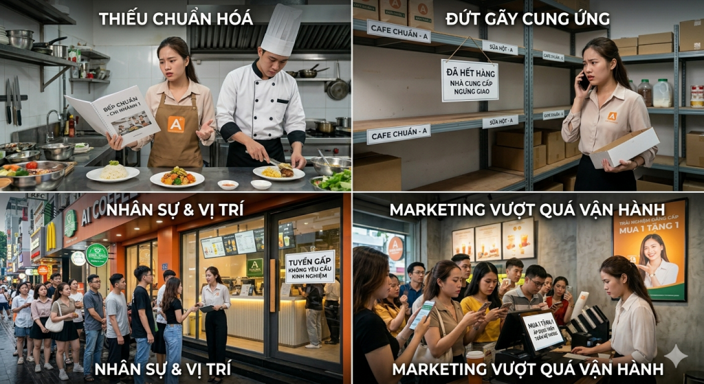 Sự hấp dẫn của mô hình này đến từ khả năng nhân rộng doanh thu và tăng độ phủ thương hiệu. Tuy nhiên, chính kỳ vọng tăng trưởng nhanh lại trở thành áp lực lớn nhất. Trên thực tế, nhiều doanh nghiệp mở rộng dựa trên cảm tính hoặc áp lực từ nhà đầu tư, thay vì dựa trên năng lực vận hành nội tại. Một cửa hàng hoạt động hiệu quả không đồng nghĩa với việc mô hình đó có thể nhân bản thành công ở 10 hay 50 địa điểm khác nhau.